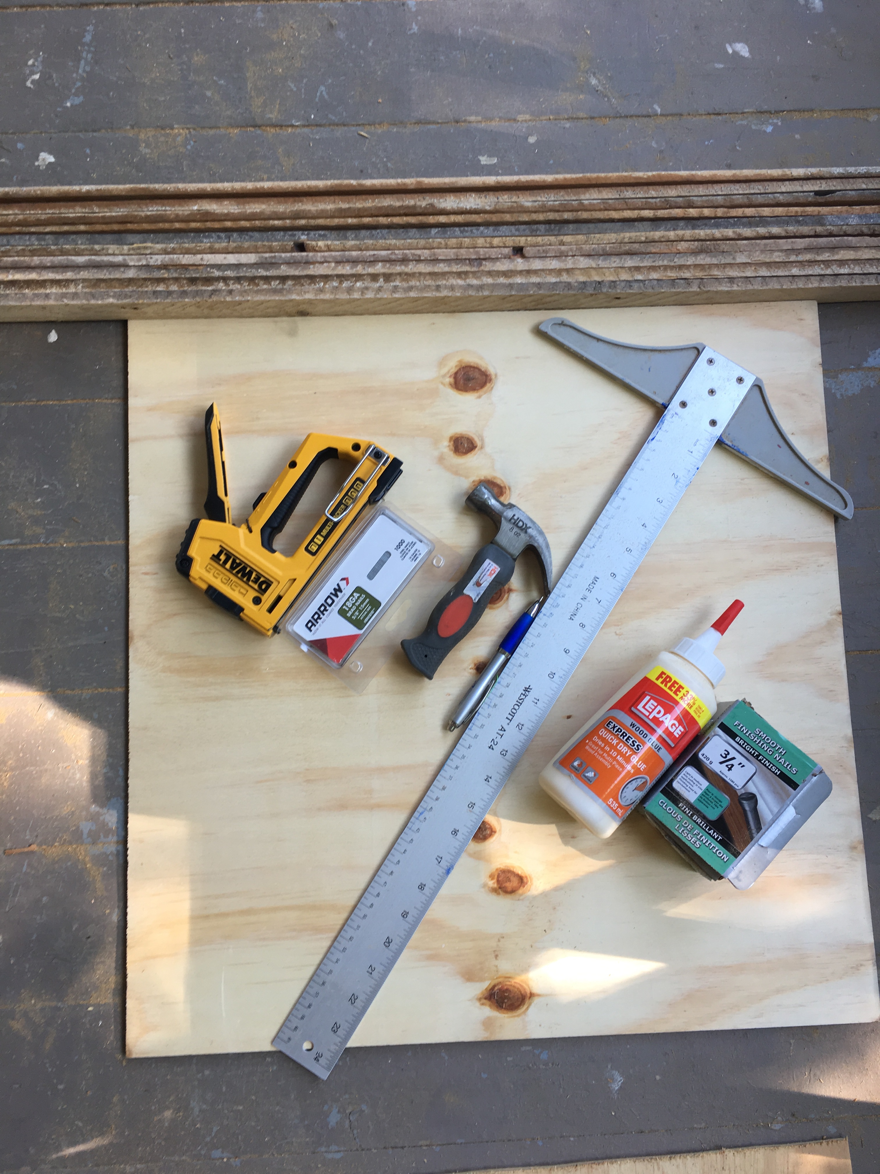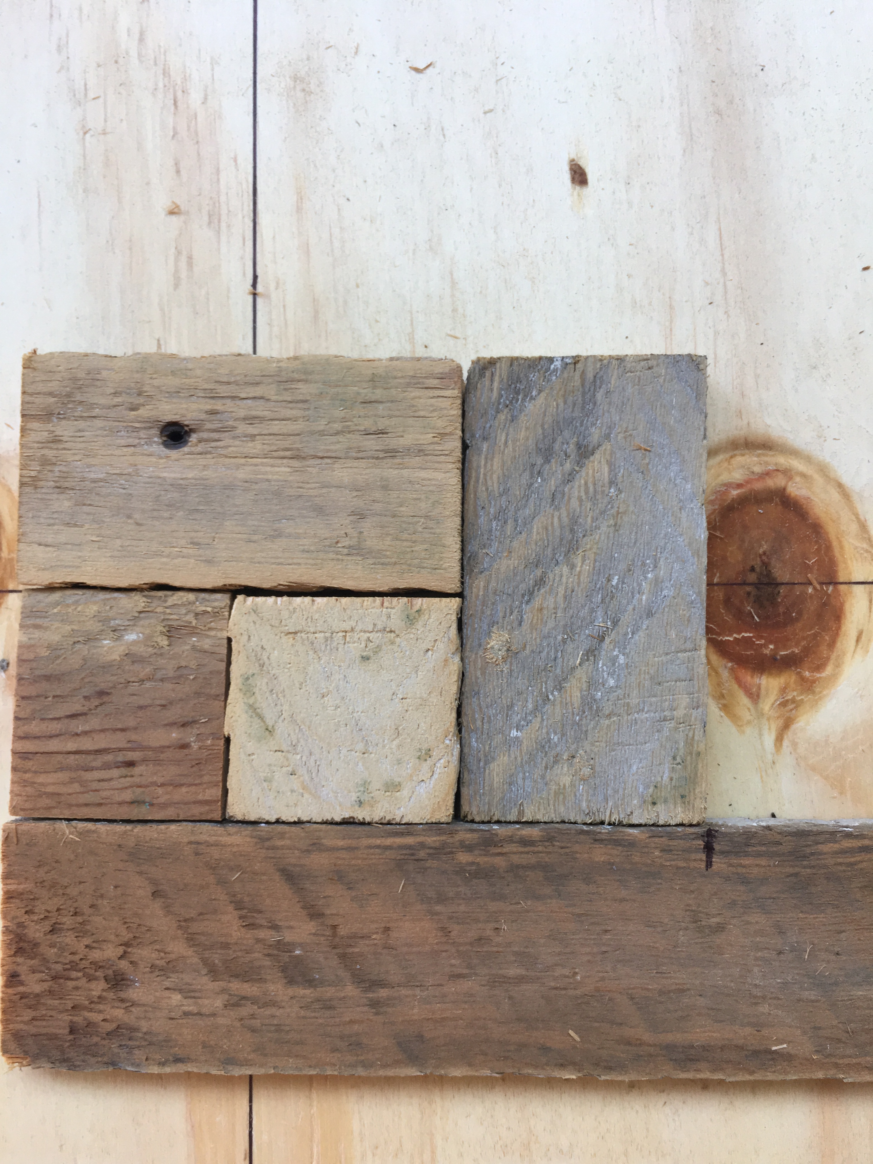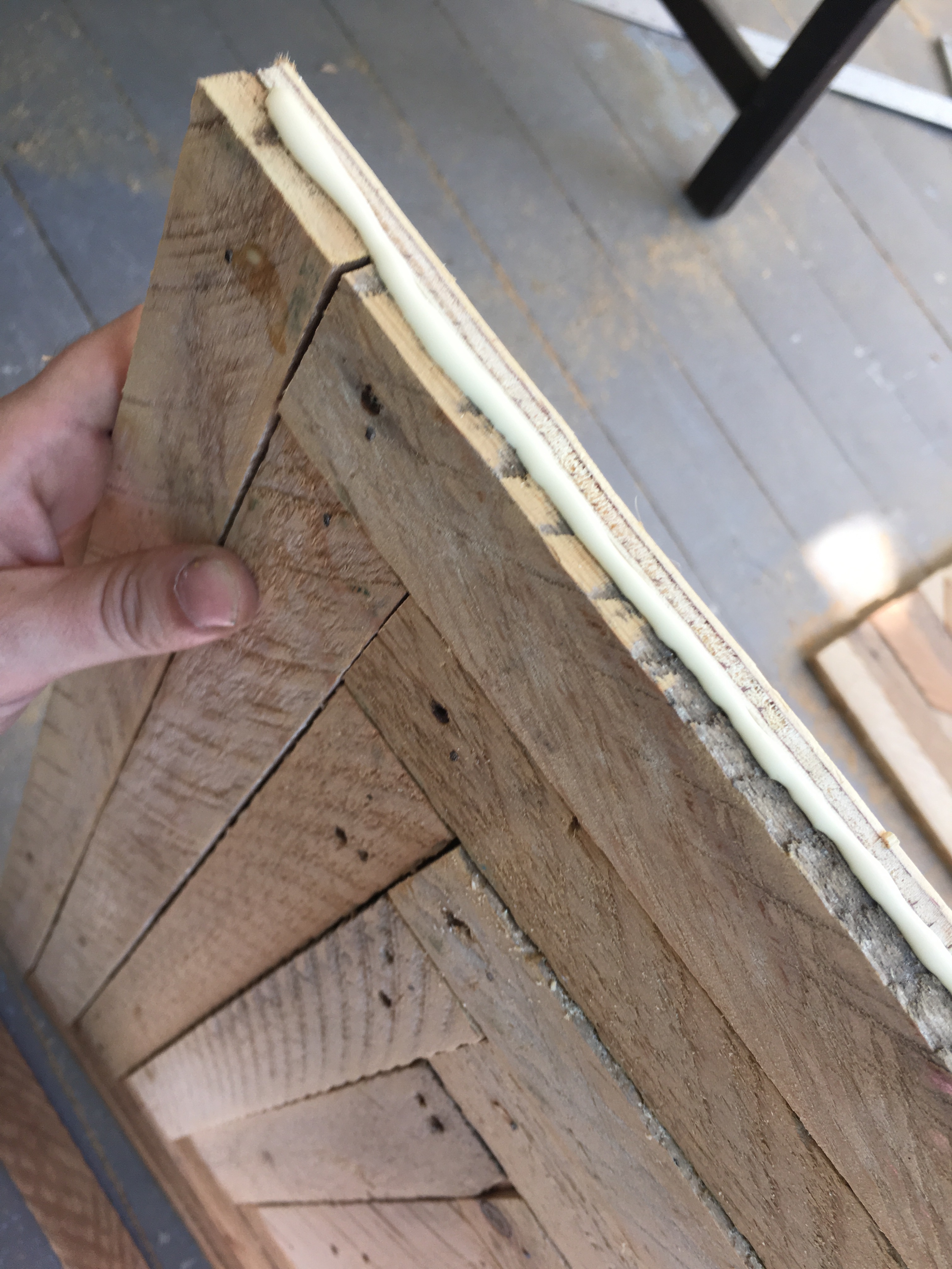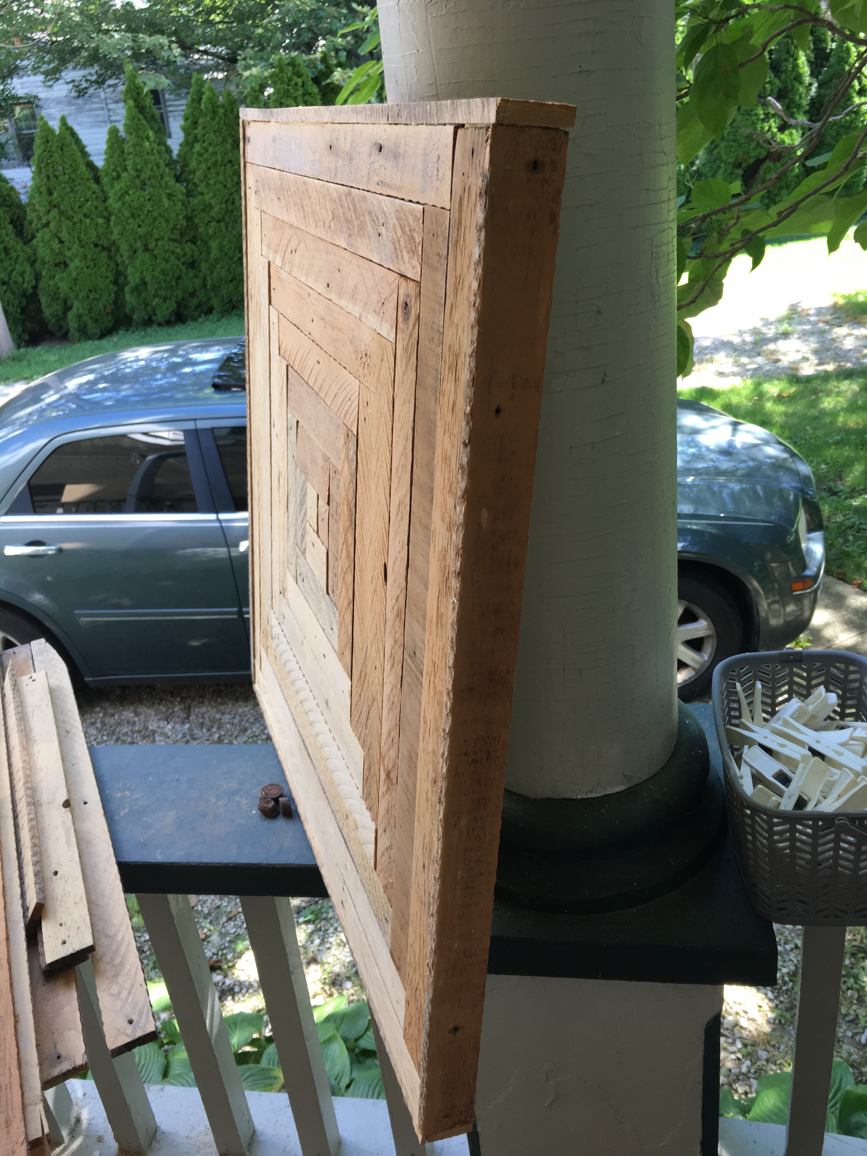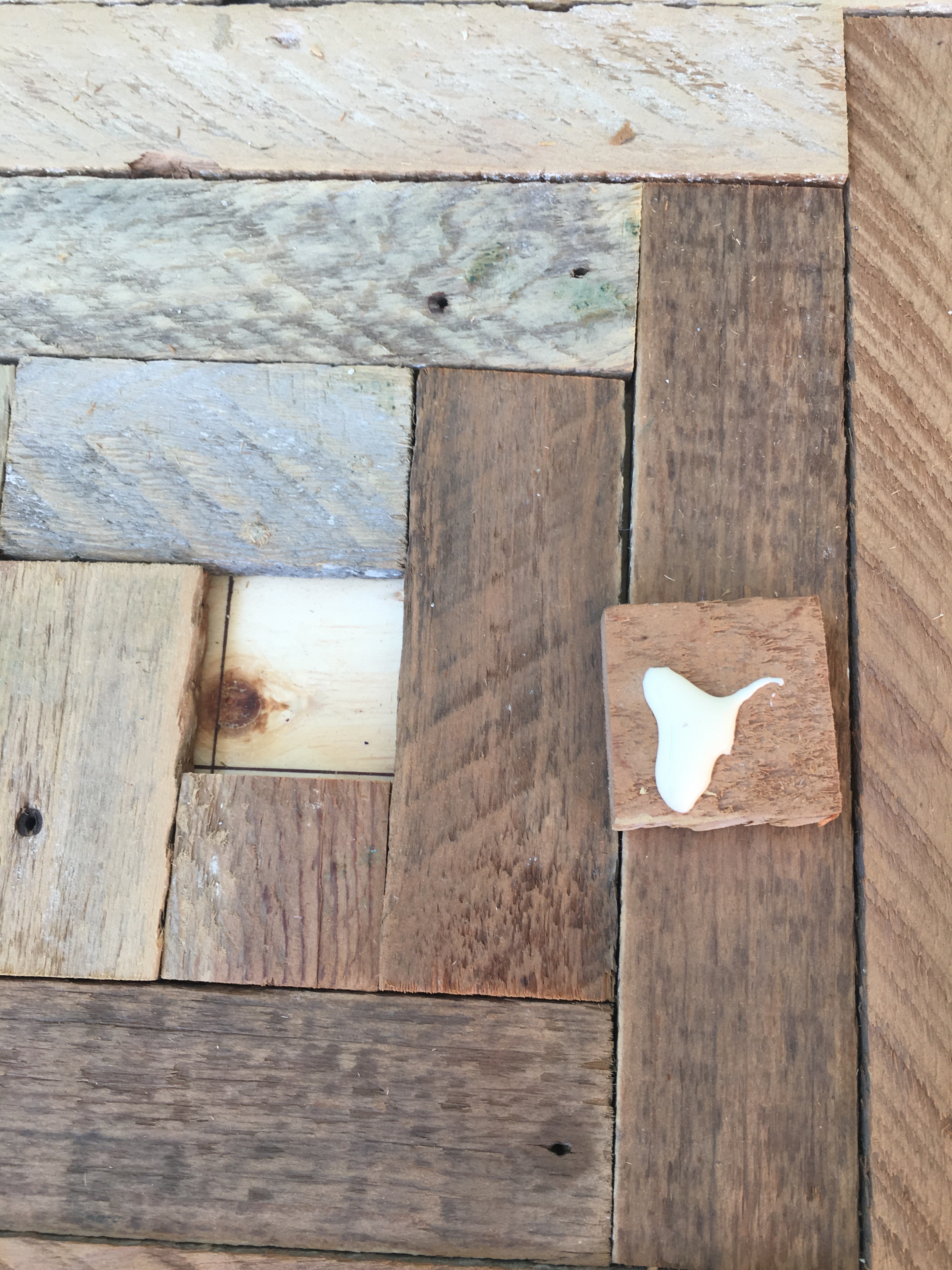 Once all pieces are glued down to the backer board I use my staple gun with small brads. I put one brad nail in each of the center squares and 2 nails in all other pieces, one on each end.