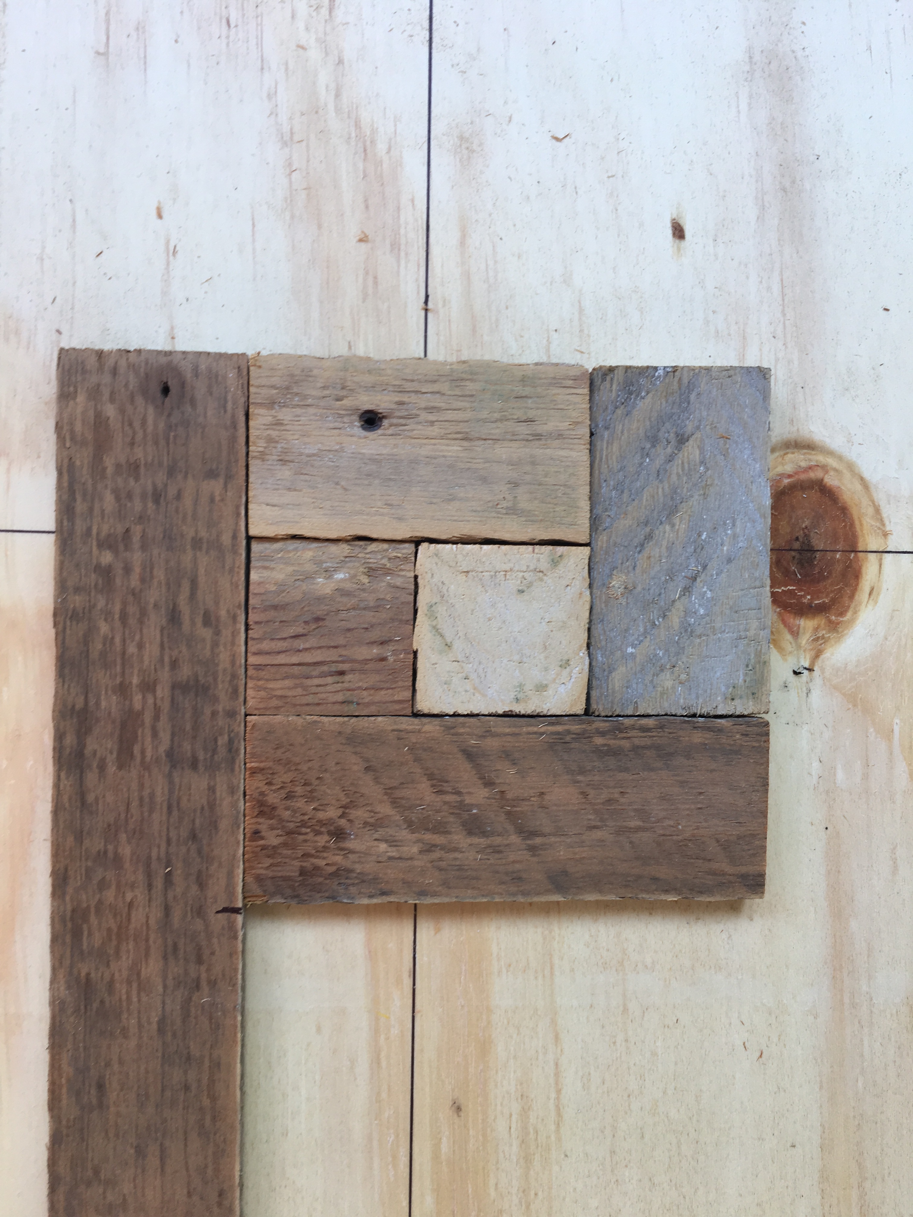 Your going to keep going working around your piece. If you forget which side is next simply notice where 3 wood pieces are meeting together, that’s the side that needs the next piece. As shown above with the arrows.