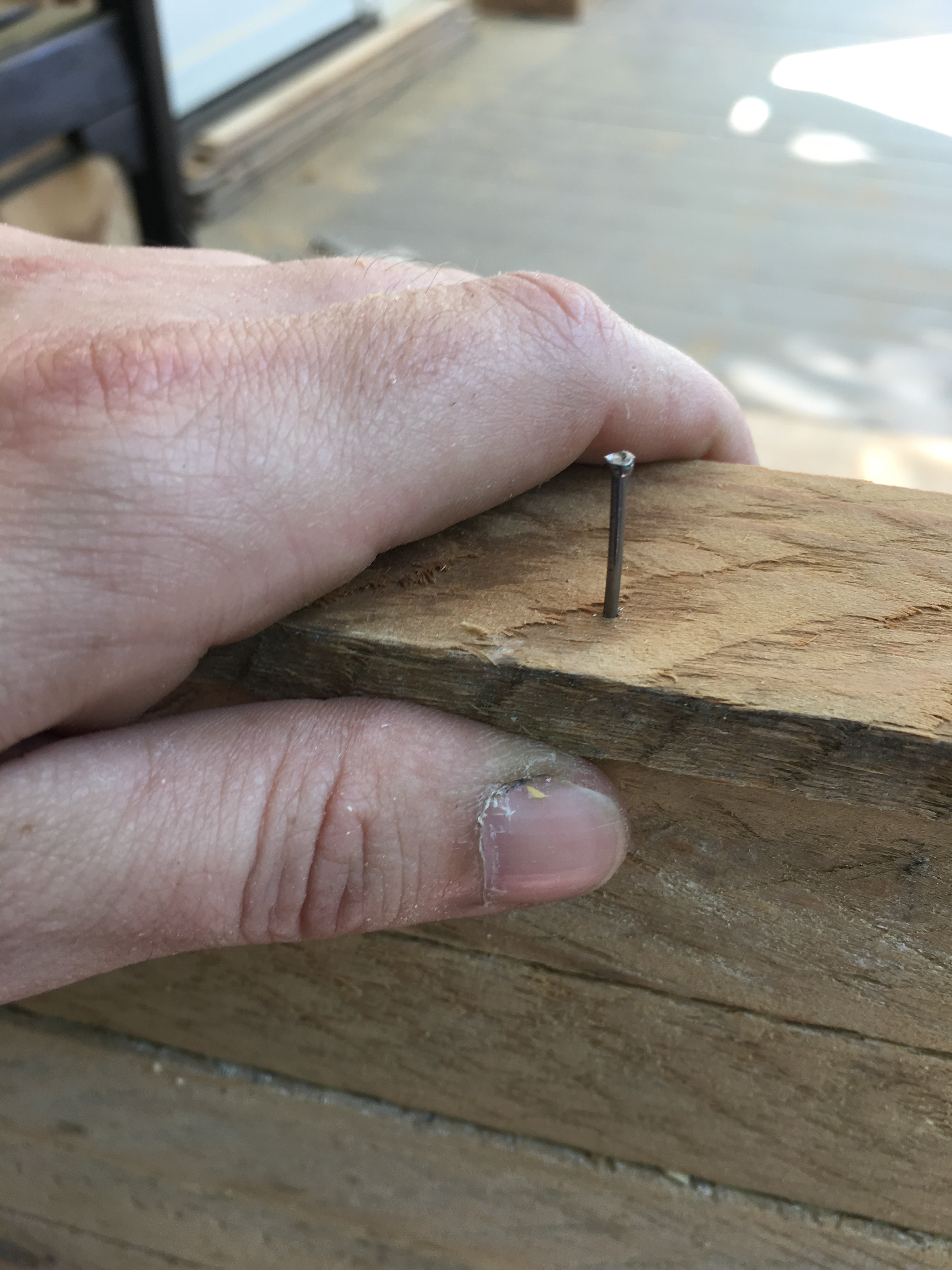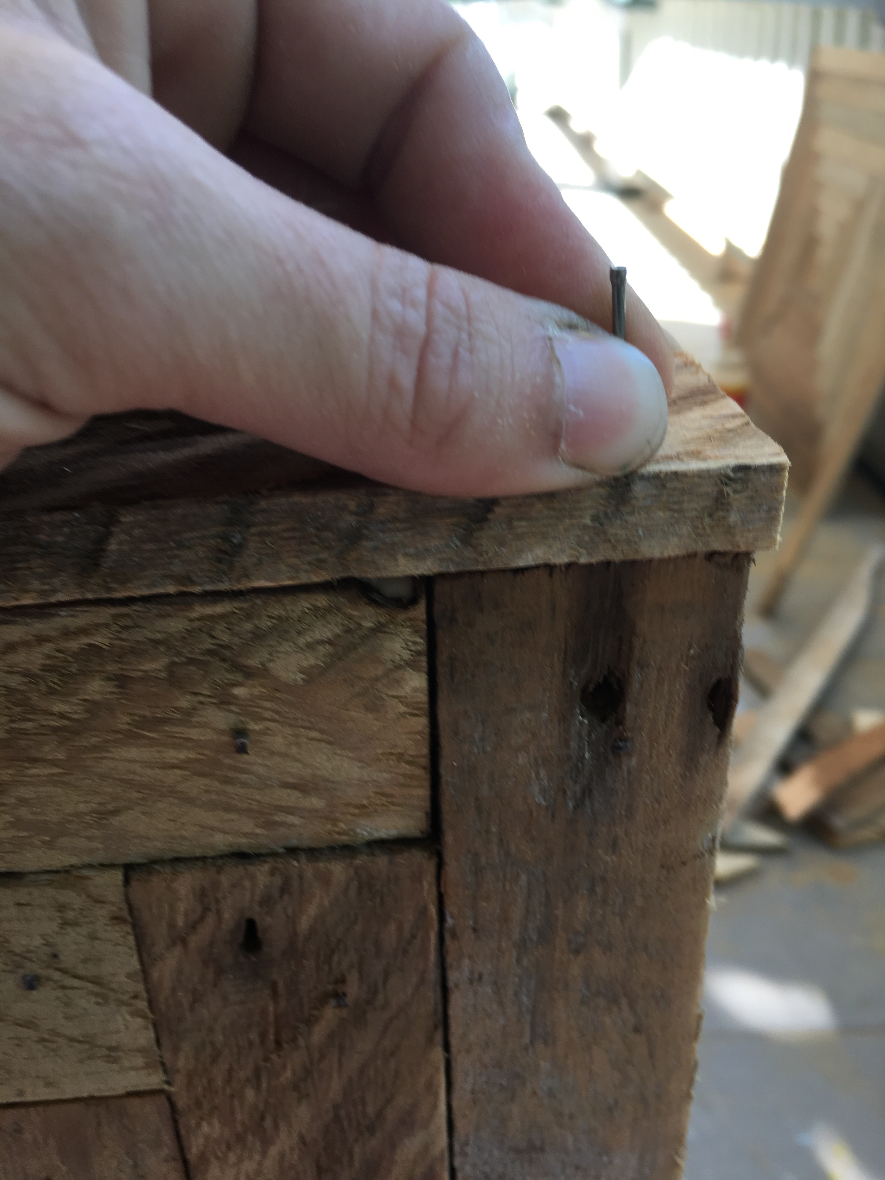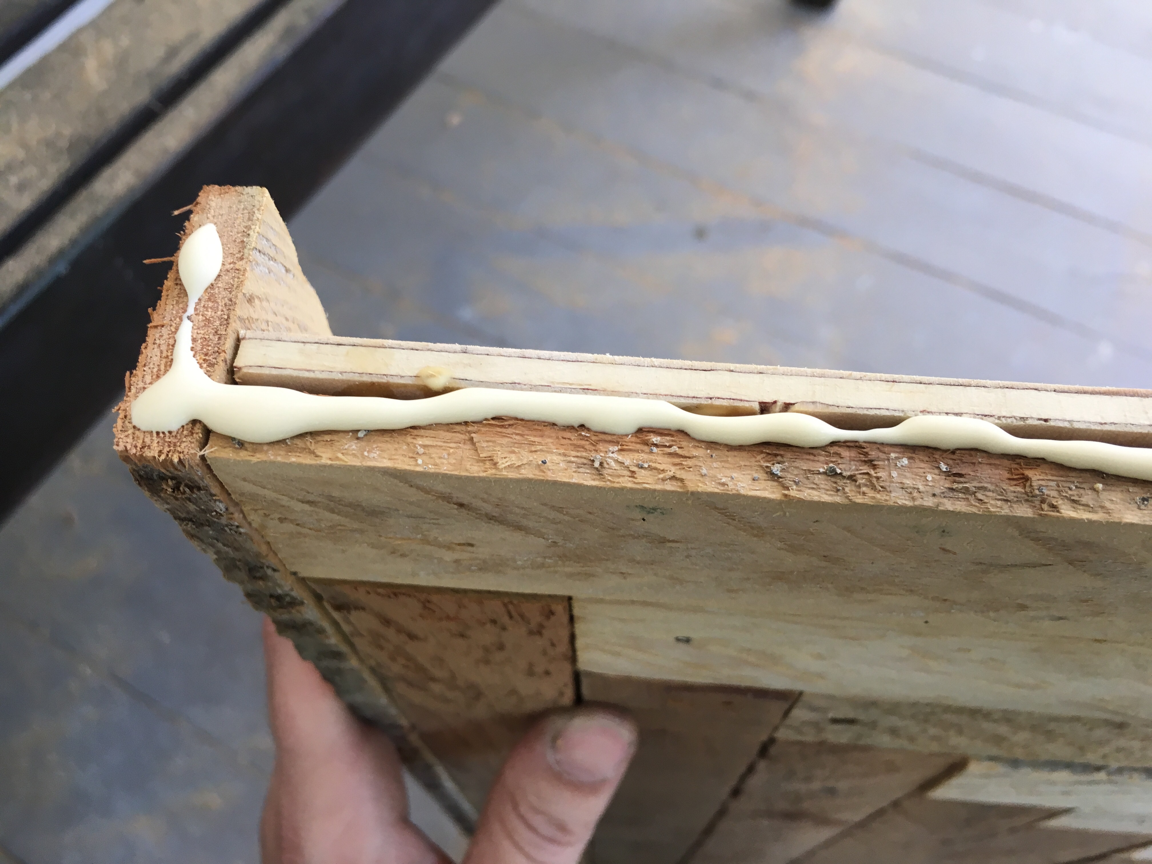 Holding the piece vertically, I add glue, position the piece of lath and nail all along with 3/4″ finishing nails.